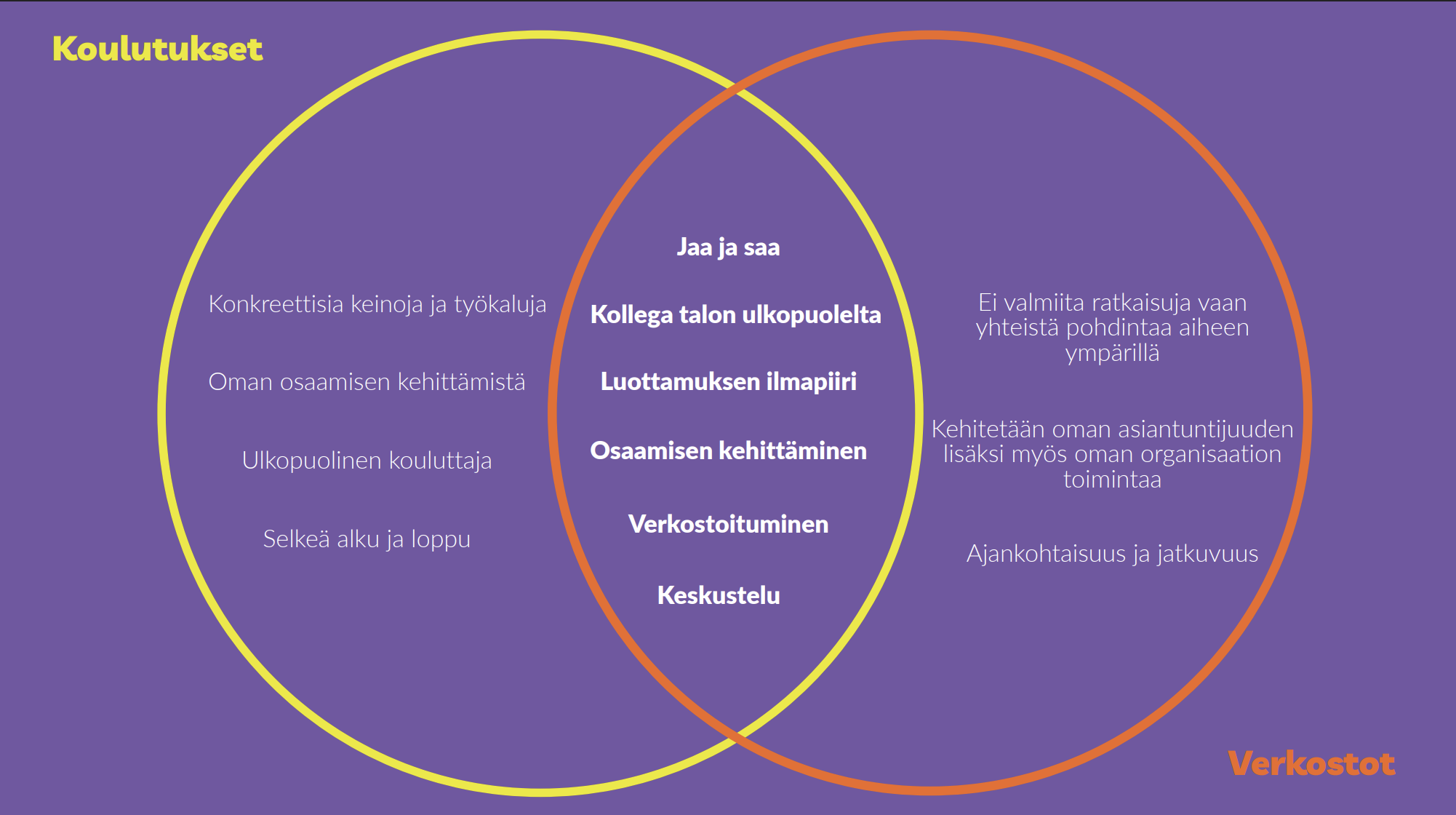 Kaiken kaikkiaan verkostot ovat kuin luotettava viiteryhmä arjen keskellä. Koulutukset taas tuovat fokusta, sparrausta ja uusia taitoja. Yhdessä ne muodostavat kokonaisuuden, jossa jäsenet voivat sekä kasvaa yksilöinä että kehittyä organisaationa.